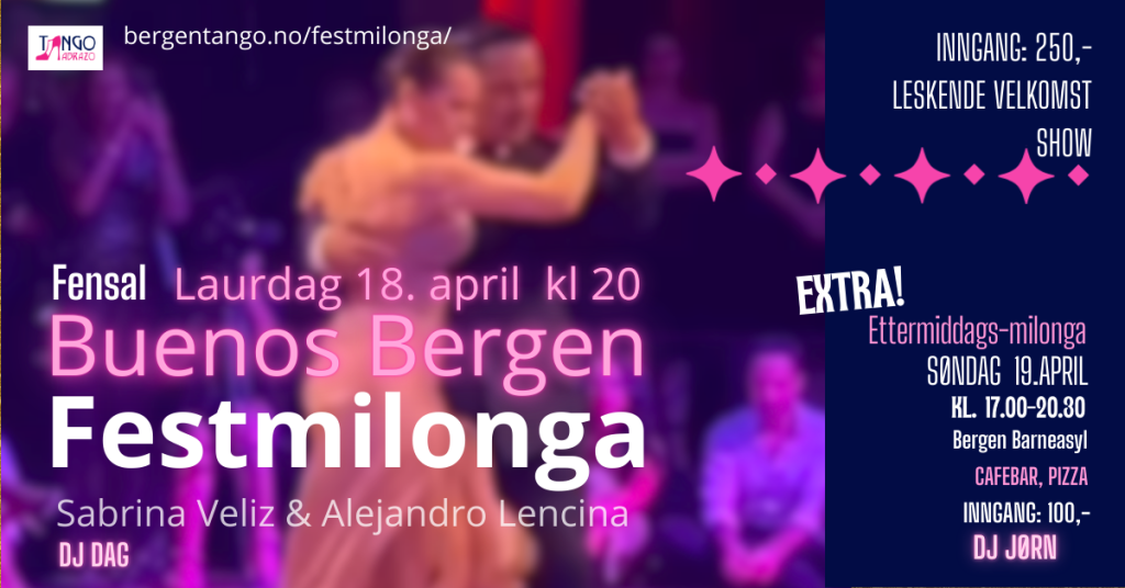 ๐๐ง ๐ค๐ฃ๐๐ค๐ค ๐ญ๐๐ง๐ ๐จ๐ฎ๐ค๐ ๐ข ๐ฏ๐๐ง๐ญ๐ ๐ญ๐ข๐ฅ ๐จ๐ฉ๐ฉ๐ฏ๐๐ซ๐ฆ๐ข๐ง๐ ๐ญ๐ข๐ฅ Buenos Bergen Milonga Weekend. Har du vรฆrt pรฅ kurs i det siste og vil รธve litt pรฅ det, men lurer pรฅ ting? Kom pรฅ veiledet praktika med Ragnhild pรฅ tirsdag โ veldig kjekt! To andre gode tilbud du ikke mรฅ gรฅ glipp av: – Valskurs med Frantz Joszef og Mikaela i helgen som kjem (sjekk ut lenken i kommentarfeltet) – Sjekk ut pรฅmeldingen til seminarer med Sabrina og Alejandro i april. Sjekk ut lenken i kommentarfeltet. … Les merLes mindre